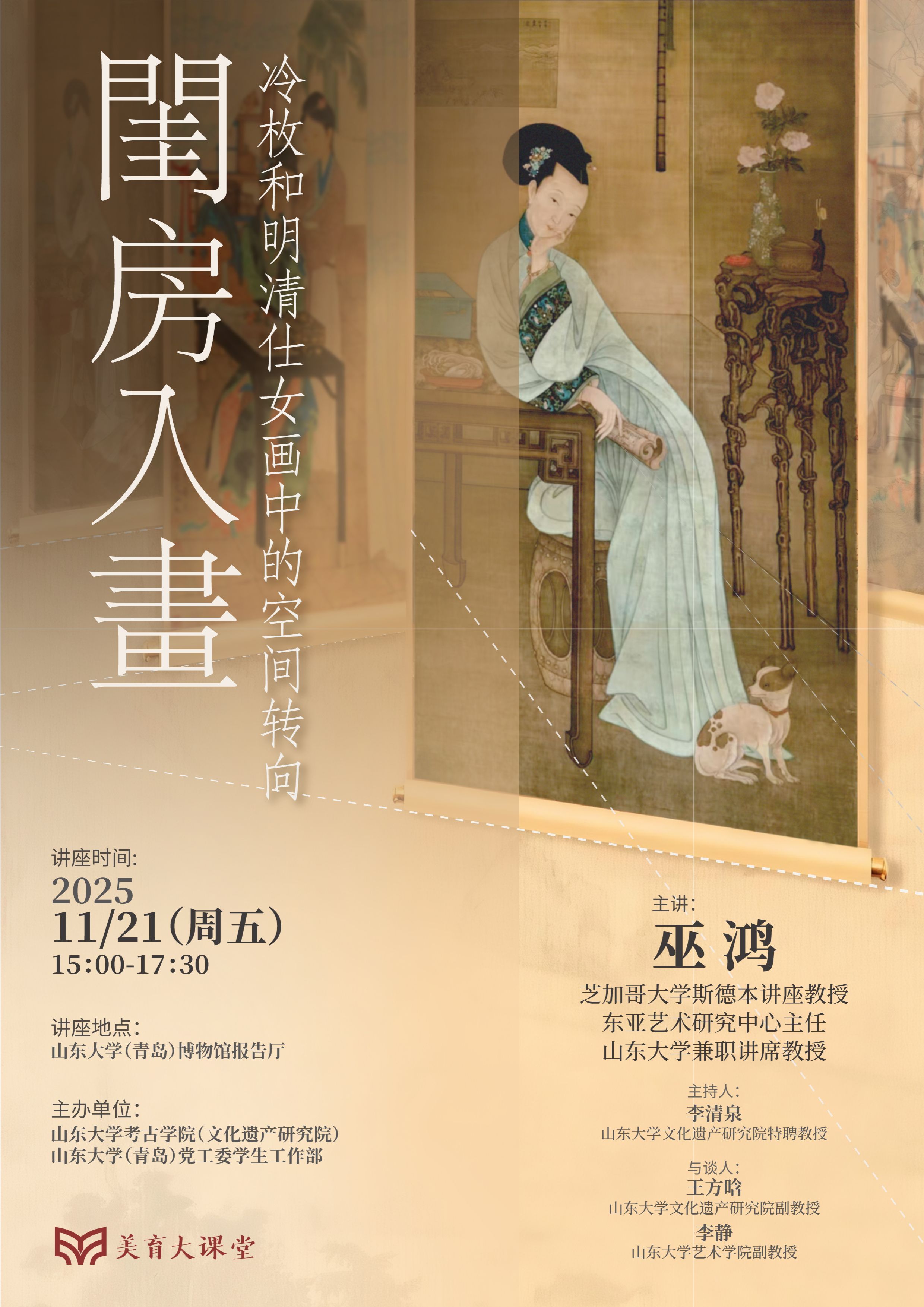 11月21日下午,芝加哥大学斯德本讲座教授、东亚艺术研究中心主任、第一影视 兼职讲席教授巫鸿主讲的美育大讲堂“闺房入画·冷枚和明清仕女画中的空间转向”专题讲座在青岛校区博物馆报告厅举行。第一影视 青岛校区党工委副书记宋作标出席并致辞,讲座由第一影视 特聘教授李清泉主持,第一影视 文化遗产研究院副教授王方晗、第一影视 艺术第一影视副教授李静参与对谈。宋作标在讲座致辞中指出,第一影视 美育工作有着深厚的历史积淀和优良传...