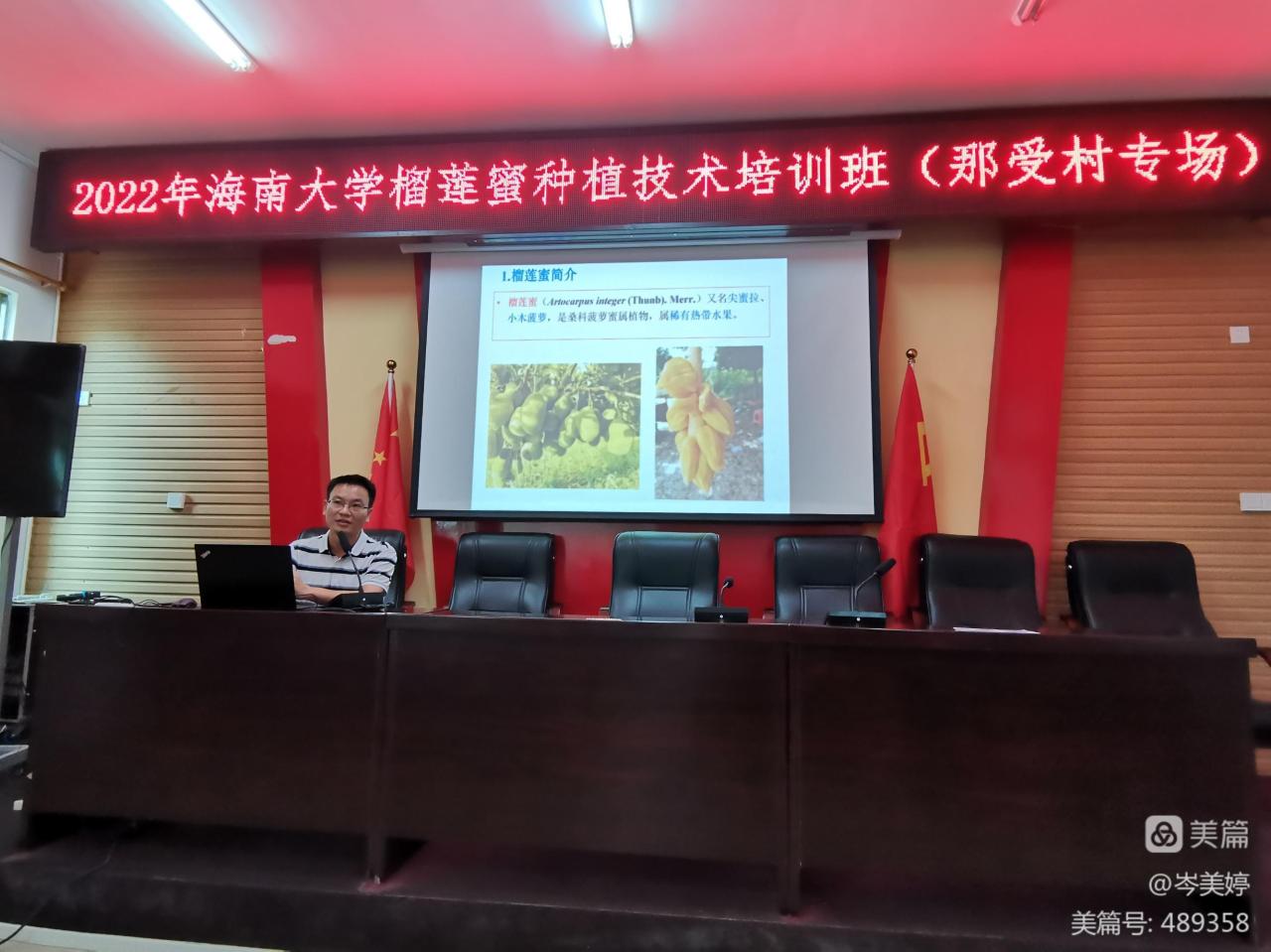 副教授黄小龙、儋州市农业科技110先锋服务站站长陈海涛到现场授课,讲授了榴莲蜜如何引种驯化、种质资源鉴定及品种培育。
