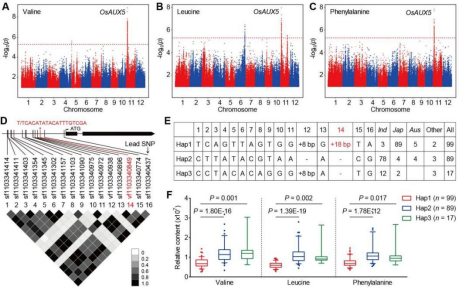 三亚南繁研究院的罗杰教授团队在Molecular Plant (IF=21.9)上在线发表题为“Natural variations of OsAUX5, a target gene of OsWRKY78, control the contents of neutral essential amino acids in rice grains” 的研究论文。该研究利用全基因组关联分析(GWAS)鉴定到控制水稻籽粒多种EAA积累的关键基因OsAUX5,为水稻营养品质改良提供了重要基因资源。