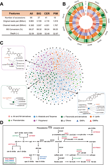 Note:(A) Summary of whole-genome bisulfite sequencing.; (B) Distribution of DMRs across the tomato chromosomes and the relationship with other genomic features. From one to five are tomato chromosomes, genes, TEs, Dos-DMRs, and Imp-DMRs. The density of each type was calculated based on a 1 Mb window, and dark colors represent high numbers in each ring.(C) Network showing the association among metabolites, SNPs and DMRs.(D) The diagram shows the known genes and candidate genes identified in this study involved in the polyphenol biosynthetic pathway. The genes with red, blue, and green colors represent the genes that are only significantly associated with mGWAS, mEWAS and both methods, respectively.
