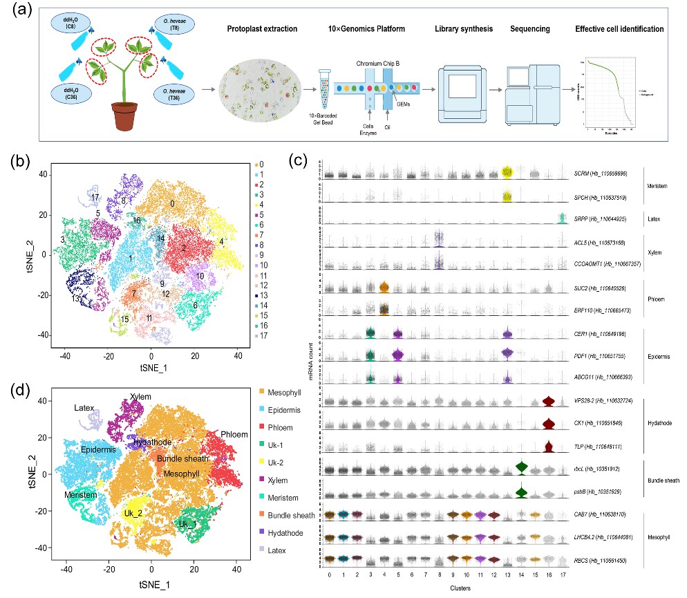 作为一种多年生木本植物,橡胶树(Hevea brasiliensis)需要通过多种类型的细胞基因表达来适应各种环境挑战。目前该物种在细胞水平上的基因表达图谱尚不清楚,细胞对病原体侵染等外界刺激的响应机制需要深入研究。据此,本团队利用单细胞RNA测序技术对早期白粉病侵染期间的橡胶树叶片进行了转录组分析,鉴定出了10种细胞类型,并构建了第一个橡胶树叶片的单细胞图谱,观察到了不同的细胞簇在白粉病侵染条件下的基因表达模式,多数参与宿主-病原体相互作用的基因随着侵染进程呈现上调表达。