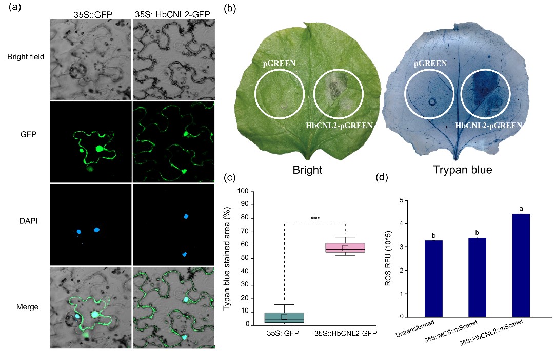 本团队同时发现一个编码核苷酸结合的富含亮氨酸重复蛋白的HbCNL2基因,正向调控橡胶树对白粉病的抗性。在烟草叶片过量表达HbCNL2基因中触发了典型的细胞坏死表型,在橡胶树叶片的原生质体中触发了高水平的活性氧。HbCNL2蛋白定位在细胞膜和细胞核中,其LRR结构域与细胞核中分子伴侣HbHSP90的ATPase结构域相互作用。本研究首次揭示了橡胶树叶片对病原菌侵染的细胞和分子水平响应,为指导橡胶树抗病种质的选育提供了重要的理论基础。