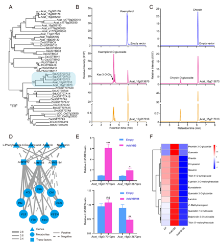 Note:(A) Phylogenetic analysis using the amino acid sequences of UGT genes obtained from different plant species. The branch of two candidate genes is selected in the blue box. (B) HPLC chromatograms of the reaction of Acat_16g013670 and Acat_15g017010 using UDP-glucoside and kaempferol as substrates. (C) HPLC chromatograms of the reaction of Acat_16g013670 and Acat_15g017010 using UDP-glucoside and chrysin as substrates. (D) Networks were established from correlation analysis of metabolites, structural genes, and TFs of the flavonoid biosynthesis pathway. (E) Dual-luciferase reporter assay showing that AcMYB5 and AcMYB194 can induce the activity of a joint promoter of the Acat_15g017010 and Acat_16g013670 genes. (F) Flavonoid content in extracts of tobacco leaves expressing AcMYB5 and AcMYB194.