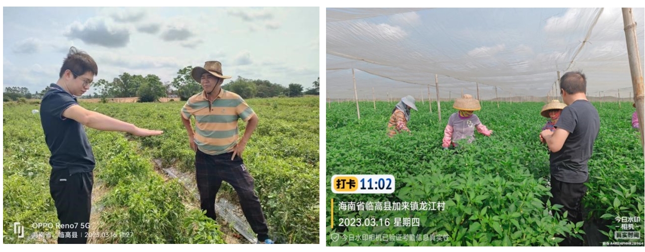 2023年3月16日,热带瓜类作物种质资源创新利用团队骨干教师王宝龙老师率队到临高县加来镇龙江村开展辣椒荫棚种植技术指导,科普露天种植和荫棚种植对辣长势和产量的影响。