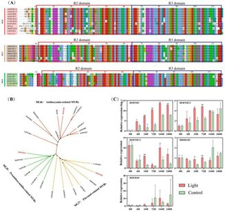 图2. (A)芒果和其他植物中类黄酮合成相关MYBs的多序列比对结果。(B)源自芒果和其他植物物种中类黄酮相关MYBs氨基酸序列的系统发育树。(C)光处理对‘Zill’芒果果皮中类黄酮化合物相关MiMYBs、MibHLH2和MiWD40表达的影响。