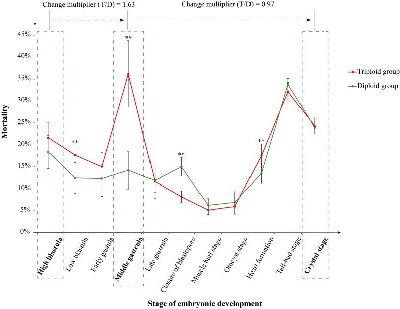 Note: Blue boxes indicate the three stages at which samples were collected. Change multiplier (T/D) indicates the ratio of T to D mortality during development from the high blastula to middle gastrula stage and from the middle gastrula to crystal stage. indicates T and D showed extremely significant difference in mortality in this stage.