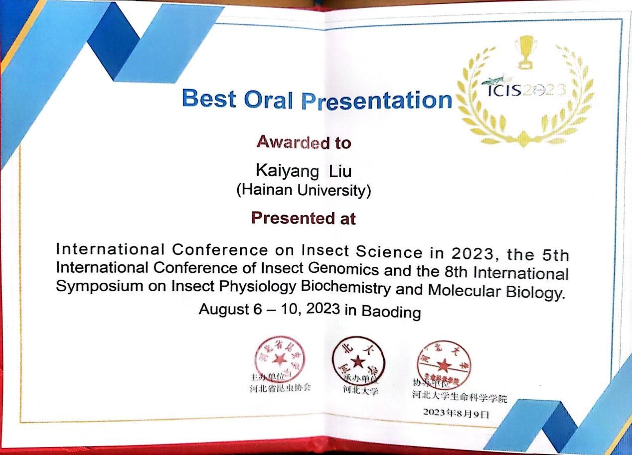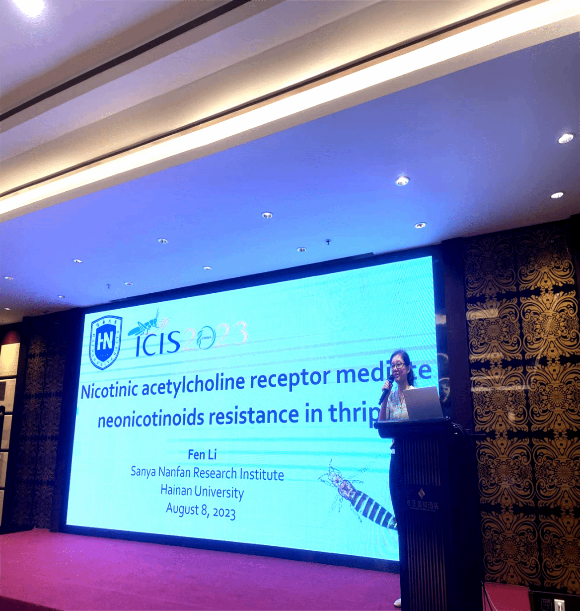 同时,吴少英教授团队将近期由教师李芬、张坤,博士刘凯扬、王力奎、金海峰涉及害虫神经电压门控钠通道、乙酰胆碱受体等抗性突变检测及功能验证的机理研究,能量转化膜控制害虫等绿色防控技术新方法等成果进行了汇报,研究内容丰富,报告逻辑清晰,得到了在场专家和同行的一致认可,其中博士研究生刘凯扬获得“Best Oral Presentation”奖。