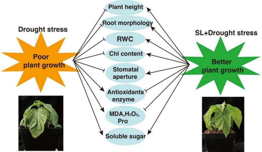研究发现干旱胁迫严重降低了光合色素的含量,破坏了根系结构系统,并改变了抗氧化机制。相反,SL应用显著恢复了叶绿素含量,改善了根系结构系统,并增加了相对叶绿素含量(SPAD)。此外,SL处理通过减少辣椒幼苗中过氧化氢(24-57%)和丙二醛(79-89%)的积累来减少氧化损伤。SL预处理的辣椒幼苗在抗氧化酶活性、脯氨酸积累和可溶性糖含量方面均有显著改善。此外,SL通路相关基因(CcSMAX2、CcSMXL6和CcSMXL3)在干旱显著下调。这些结果表明,叶面施用SL可以通过上调叶绿素含量和激活抗氧化防御机制来缓解耐旱的不利影响。