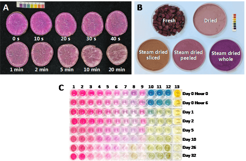 注:(A)紫薯切片与空气接触后立即褐化;(B)不同预处理制备的紫薯粉末;(C)室温下PSPA在pH 1-13下的色泽变化