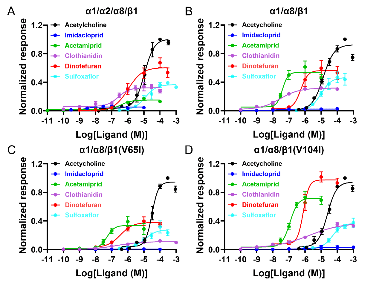 图. 配体对普通大蓟马nAChRs的浓度反应曲线