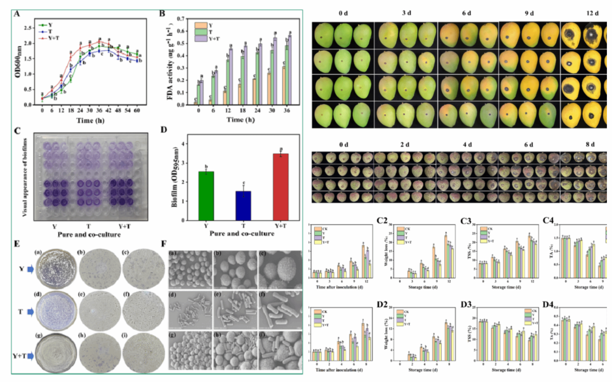 拮抗微生物是控制水果采前和采后病害的生物防控技术。本研究优化、建立了Y-1和TE-7菌株的共培养体系,该体系提高了单一菌株生长和适应能力。非靶向代谢组学揭示了特征代谢产物,包括N-乙酰-L-谷氨酸、腺嘌呤和葫芦素等在共培养体系中显著积累,涉及柠檬酸循环(TCA循环)、氨基酸生物合成、苯丙素生物合成和生物碱生物合成途径。体内和体外实验表明Y+T系统显著增强了拮抗菌对病原菌的抑制作用,增强了对芒果和荔枝果实采后病害的控制能力,减缓了采后果实失重和果皮颜色的变化,维持了总酸(TA)和总可溶性固形物(TSS)的含量,保持了果实品质。该研究为提高拮抗菌的生防效率并用于改进果实保鲜措施提供了新的策略。