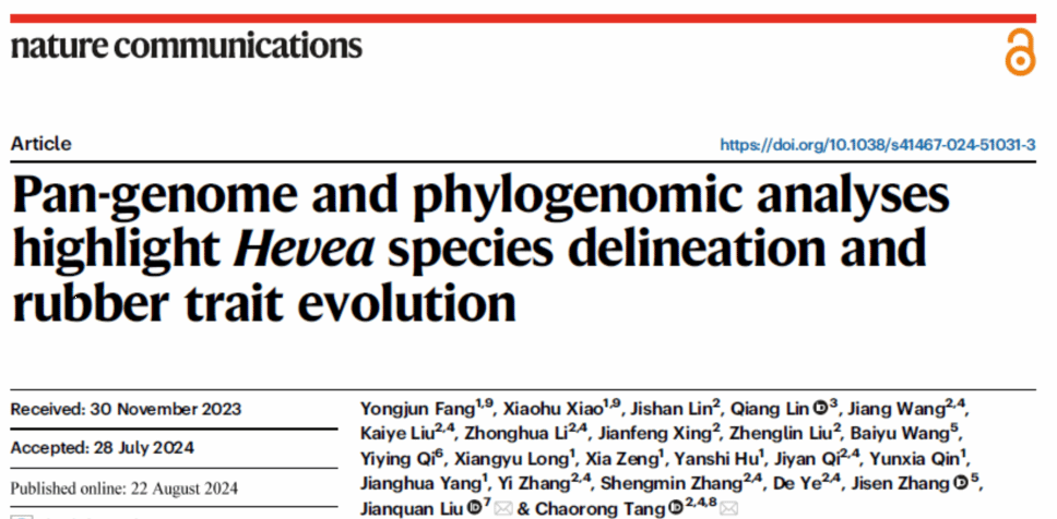 产胶生物学团队联合中国热科院橡胶所、兰州大学等团队在Nature Communications上在线发表了题为“Pan-genome and phylogenomic analyses highlight Hevea species delineation and rubber trait evolution”的研究论文。研究阐释了目前世界主要产胶国保存的三类橡胶树种质资源的遗传结构和亲缘关系,并发现橡胶延伸因子/小橡胶粒子蛋白(REF/SRPP)大基因簇的产生,及其在产胶细胞乳管中的特异性功能分化是植物形成产胶这种抗虫性状的一个关键性进化事件。研究结果为进一步探究产胶性状的进化机制,加快橡胶树资源的高效利用和品种遗传改良提供了重要理论依据和资源支撑。