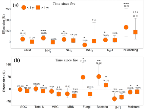 火灾对土壤氮循环的影响存在明显的时间效应。火灾发生后一年内,土壤GNM、铵态氮浓度和N2O排放均显著提升,但硝态氮固定明显降低;土壤氮淋失在短期(<1年)和长期(>1年)内均显著增加。火灾的后果是土壤氮有效性和N2O排放量的短暂增加(持续时间不到一年),但随着时间的推移,氮的淋失风险仍持续存在。