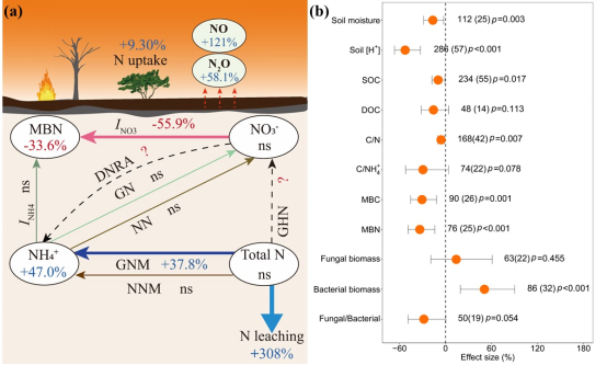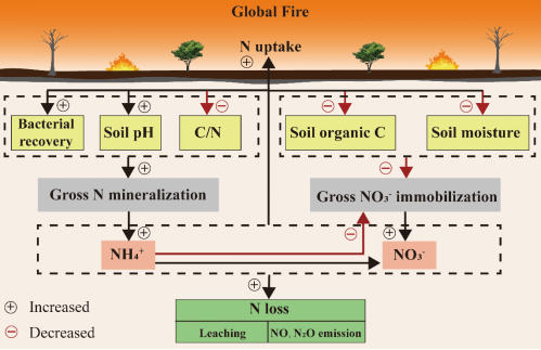 火灾会直接或间接的影响全球陆地生态系统物质循环过程。本研究结果发现,火灾增加了土壤氮初级矿化速率(GNM)和铵态氮浓度,但降低了土壤硝态氮固定能力,导致土壤氧化亚氮(N2O)和一氧化氮(NO)排放以及氮径流/渗漏损失的增加。