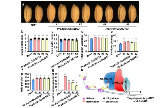 该研究获得一系列水稻种子大小发生变化的突变体,其中ng1和ng2突变体表现出种子变小、植株矮化及叶片变窄的表型。NG1和NG2分别编码细胞核定位的中介体复合体亚基OsMED23和H3K4去甲基化酶OsJMJ703。OsMED23与OsJMJ703在生化上能直接互作,并在遗传上位于同一通路调控种子大小和重量。进一步研究发现,OsJMJ703-OsMED23与转录因子OsWOX3A互作,并形成一个三元调控模块,通过结合种子大小和重量关键基因GW2和OsLAC的启动子区域,降低H3K4me3修饰水平进而抑制其表达。田间试验表明,过量表达OsMED23或OsJMJ703的转基因植株水稻种子大小和重量显著增加,小区产量提高15.2%-18.9%。该研究首次揭示了组蛋白修饰因子、中介体复合体与转录因子协同调控种子大小和产量的新机制,为作物高产分子设计育种提供了新靶点。