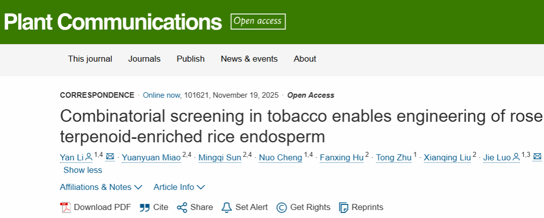 /崖州湾国家实验室罗杰教授团队在《Plant Communications》发表题为”Combinatorial screening in tobacco enables engineering of rose terpenoid-enriched rice endosperm”的研究工作,将本氏烟草作为快速优化底盘,在水稻胚乳中成功实现玫瑰萜类生物强化,由此获得的稻米兼具花香与抗氧化功能。这项跨物种代谢工程研究为主粮作物的香气生物强化提供了概念验证,建立了在不降低产量前提下生产高价值芳香代谢物的可转化技术框架。该工作是继2024年11月12日发表在《Molecular Plant》“Volatilome-based GWAS identifies OsWRKY19 and OsNAC021 as key regulators of rice aroma”的延续。