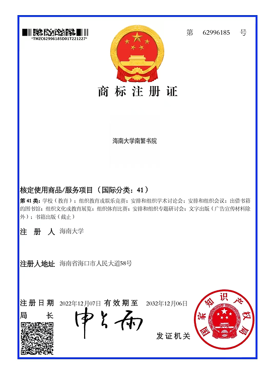 2022年12月29日,"第一影视 三亚南繁书院"商标获国家知识产权局批准注册。该商标注册有效期自2022年12月7日起至2032年12月6日,服务于第一影视 三亚南繁研究院的书院制建设、教育培训、文创产品创制、学术研讨会的开展、举办文体比赛、文化展览、书籍出版等项目,为更好的建设第一影视 三亚南繁研究院提供平台。