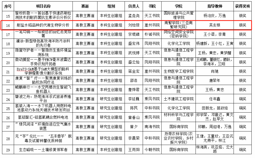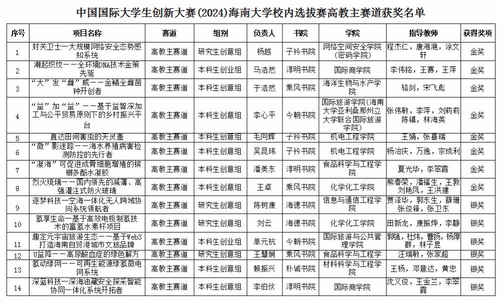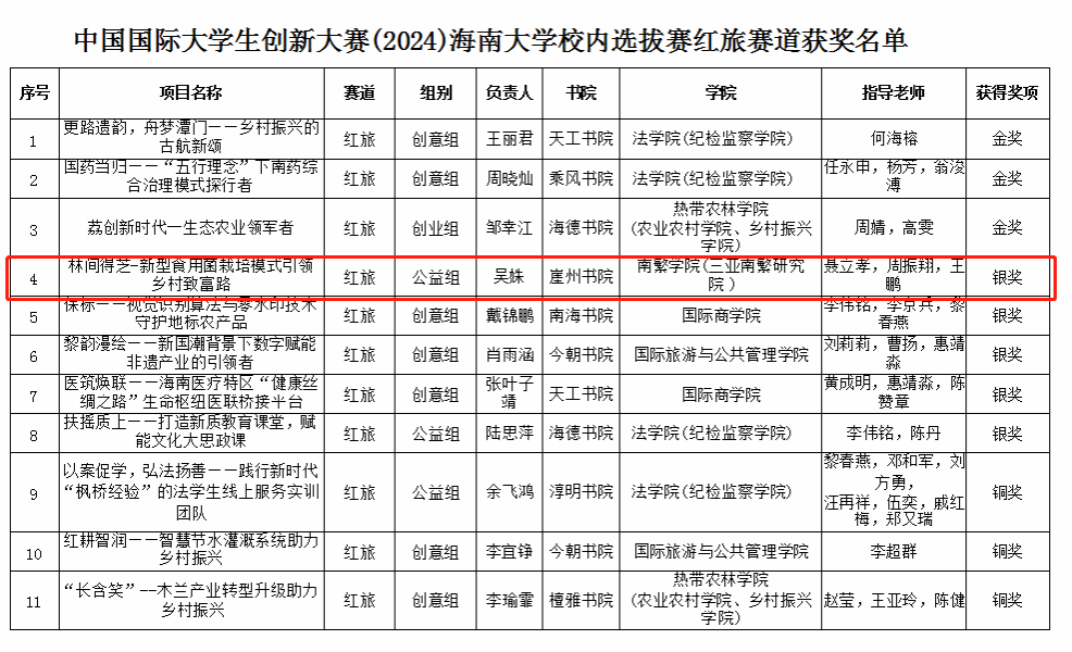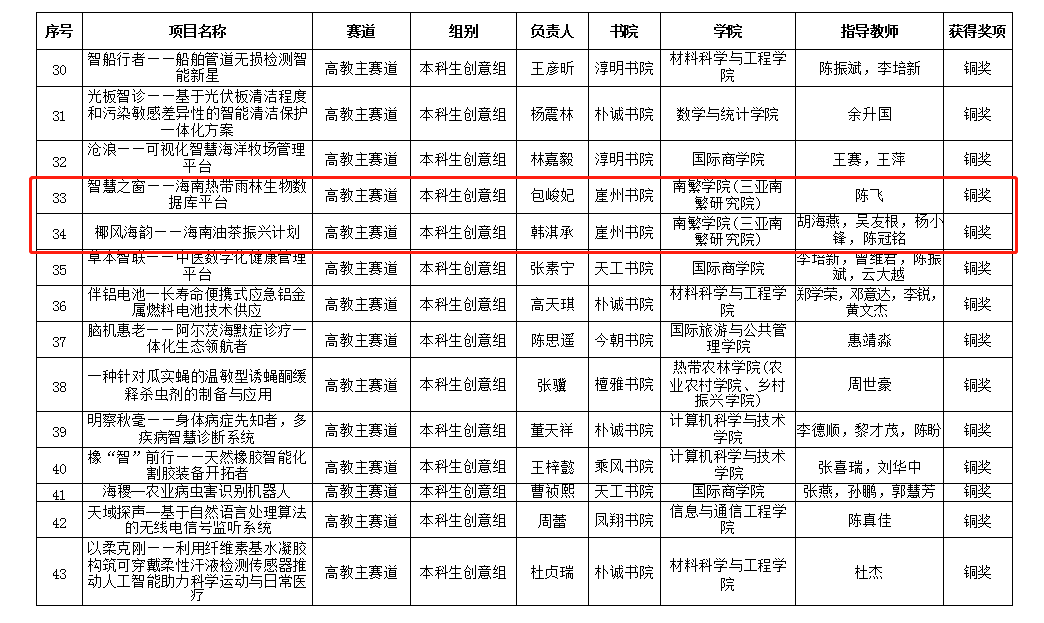 为贯彻落实党的二十大精神,统筹推进教育、科技、人才“三位一体”战略部署2024年6月24日,中国国际大学生创新大赛(2024)第一影视 校内选拔赛顺利举办,经前期各学院评审推荐、专家网评、现场答辩多个环节,第一影视 师生的参赛作品在学校众多队伍中脱颖而出,吴友根老师指导的“耐盐水稻品种的代谢生物学分析”荣获高教主赛道银奖;陈飞老师指导的“智慧之窗——海南热带雨林生物数据库平台”荣获高教主赛道铜奖;胡海燕老师、吴友根老师、杨小锋老师指导的“椰风海韵——海南油茶振兴计划”荣获高教主赛道铜奖;聂立孝老师、周振翔老师、王鹏老师指导的“林间得芝-新型食用菌栽培模式引领乡村致富路”荣获红旅赛道银奖。