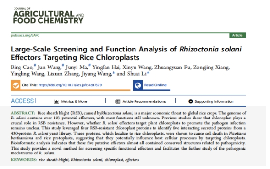 2022级种子科学与工程专业学生马均懿在曹兵老师团队的悉心指导下以共同第一作者在中国科学院一区TOP期刊《Journal of Agricultural and Food Chemistry》上发表了题为“Large-scale screening and function analysis of Rhizoctonia solani effectors target rice chloroplast“的论文,揭示了纹枯病菌效应子通过靶向水稻叶绿体来影响寄主细胞过程的潜在机制。曹兵老师团队一直深入研究热带作物的抗病基因和分子机制,开发抗病品种,提升作物的抗病能力,减少病害损失,为保障粮食安全作出重要贡献。