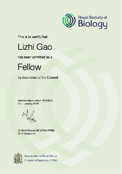 高立志教授当选为英国皇家生物学会会士(Elected Fellow of The Royal Society of Biology-UK, FRSB)。该项荣誉专门授予英国皇家生物学会认定为“对生物科学的进步做出了突出贡献的专业人士。