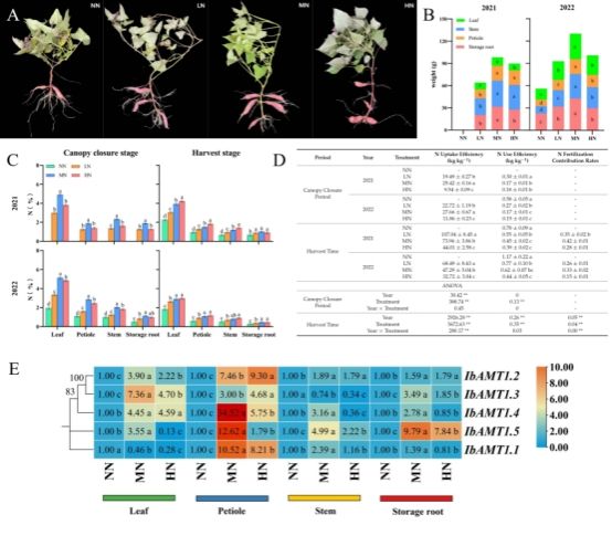 图 A、B氮素水平对甘薯块根形成期生长发育的影响,C氮素水平对甘薯氮素吸收和分配的影响,D氮素水平对甘薯氮素利用的影响,E氮素水平对甘薯块根形成期IbAMT1表达量的影响
