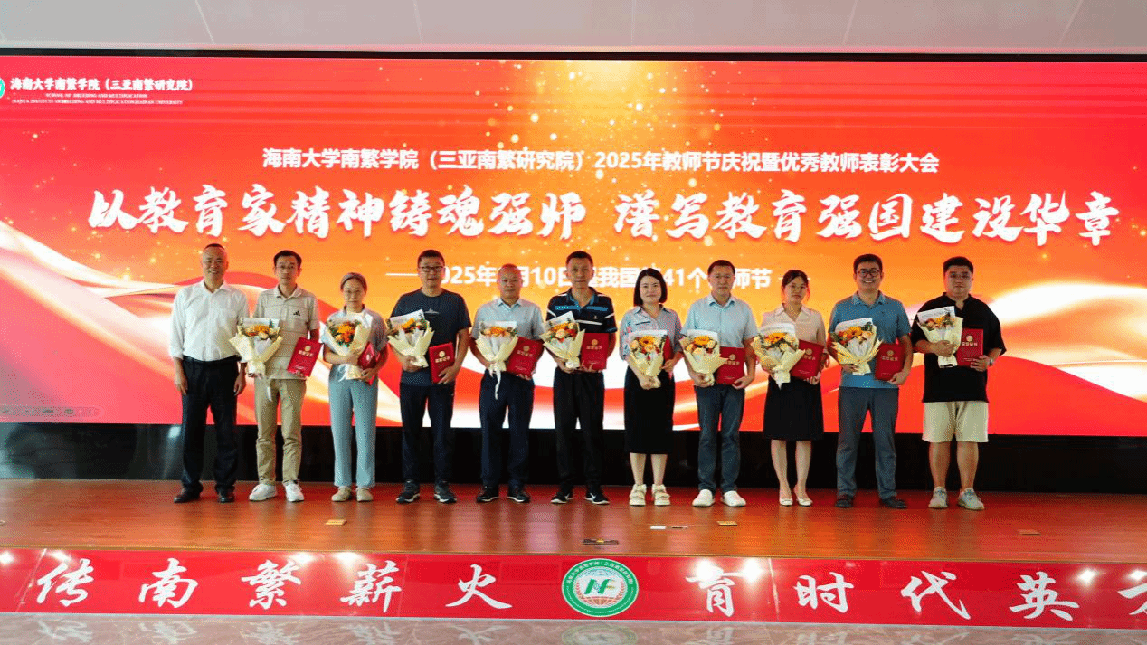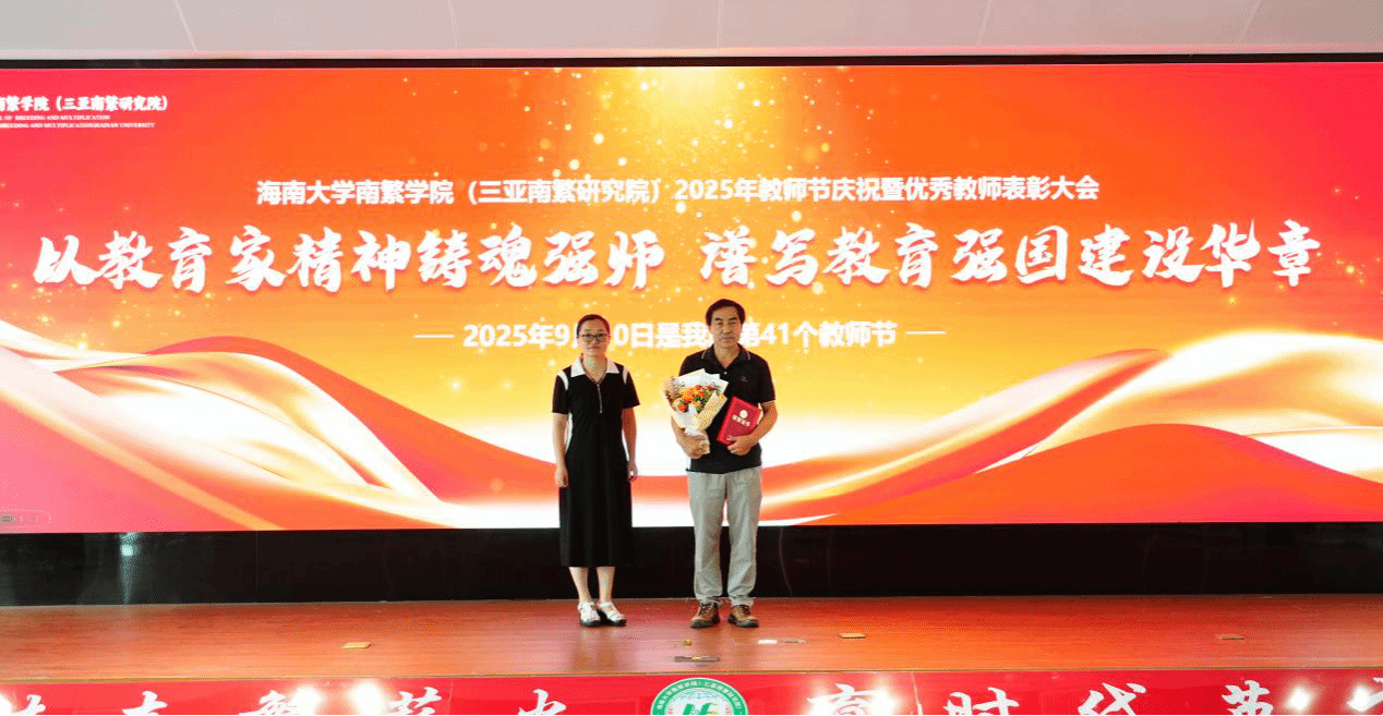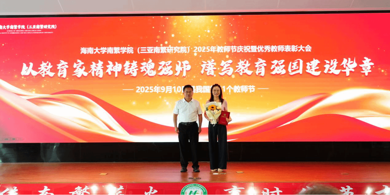 在南繁众创中心317报告厅隆重召开2025年教师节庆祝暨优秀教师表彰大会。院党委书记黄东益,院长李海燕,副院长杨小锋、吴友根、陈艳丽、夏志强、徐冉,获奖教职工代表、各入驻团队代表,院各办、中心代表,新入职教师代表,学生代表参加大会。会议由副院长杨小锋主持。