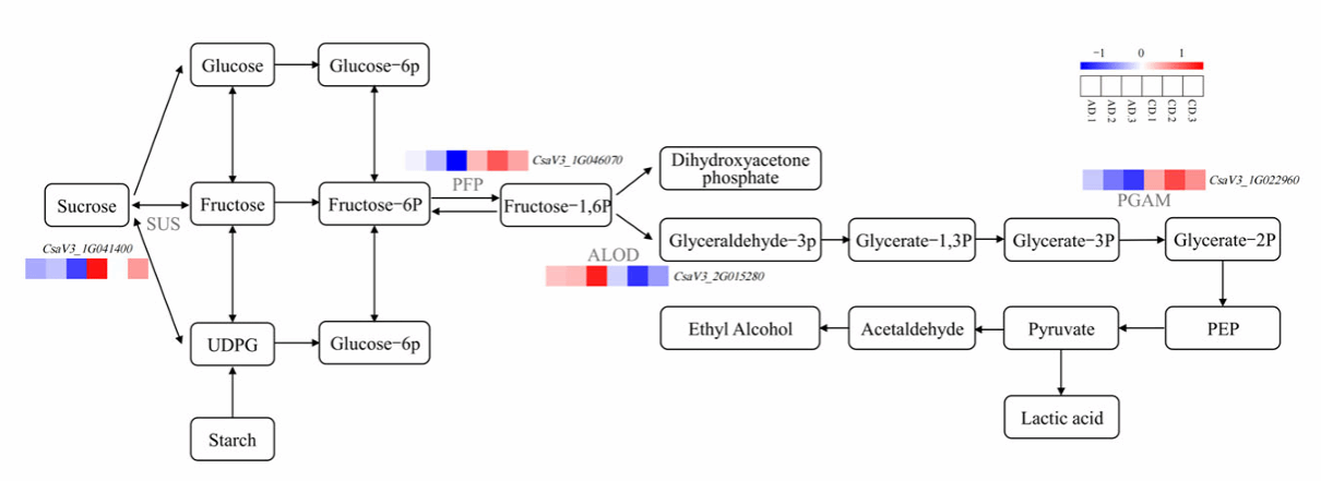 图2 特定浓度的维生素C溶液可调控淀粉和蔗糖代谢、糖酵解或糖异生途径中某些关键基因的表达